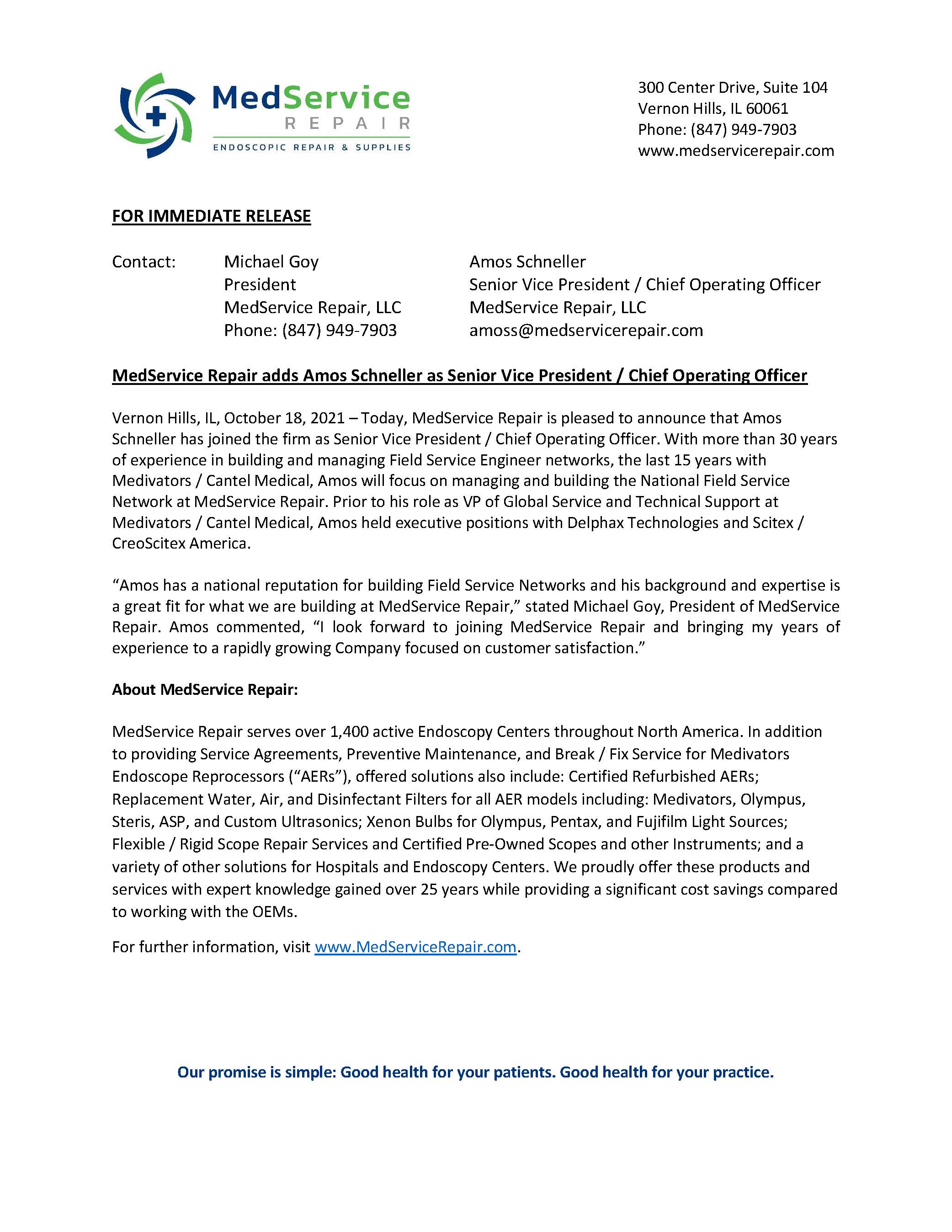 Vernon Hills, IL, October 18, 2021 – Today, MedService Repair is pleased to announce that Amos Schneller has joined the firm as Senior Vice President / Chief Operating Officer. With more than 30 years of experience in building and managing Field Service Engineer networks, the last 15 years with Medivators / Cantel Medical, Amos will focus on managing and building the National Field Service Network at MedService Repair. Prior to his role as VP of Global Service and Technical Support at Medivators / Cantel Medical, Amos held executive positions with Delphax Technologies and Scitex / CreoScitex America.